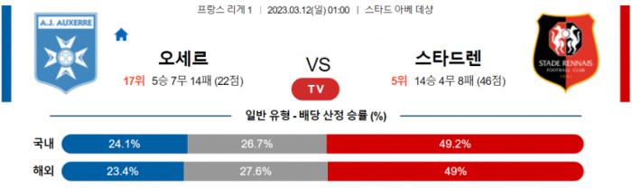 리그앙 3월 12일 00:59 AJ 오세르 : 스타드 렌 FC