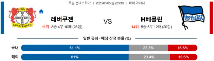 분데스리가 3월 5일 23:30 레버쿠젠 : 헤르타 베를린