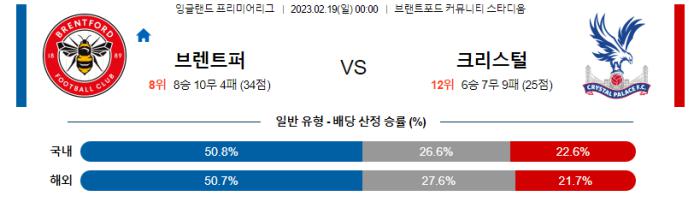 프리미어리그 2월 19일 00:00 브렌트퍼드 FC : 크리스탈 팰리스