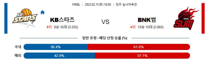 이전경기(2/9) 원정에서 신한은행 상대로 69-70 패배를 기록했으며 이전경기(2/5) 원정에서 우리은행 상대로 59-69 패배를 기록했습니다. 3연패 흐름 속에 시즌 8승16패 성적. 신한은행 상대로는 박지수가 시즌 아웃 부상을 당한 공백이 크게 나타났고 리바운드 싸움에서 -7개 마진으로 밀렸던 경기. 김민정(20득점), 강이슬(13득점), 심성영(10득점)을 제외하고는 두 자리수 득점이 나오지 않았으며 1쿼터(21-12)의 좋았던 출발을 지켜내지 못한 상황. 또한, 수비에서 실수가 많았고 34분41초를 소화한 강이슬의 휴식구간에서는 공격 작업의 전개가 전체적으로 매끄럽지 못했던 패배의 내용.