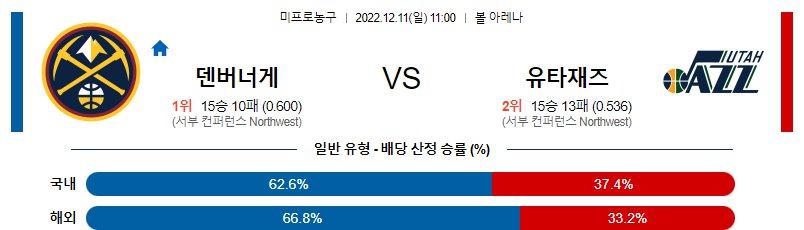 덴버가 홈 경기를 치루는만큼 좋은 모습을 보여줄 가능성이 높아보인다. 요키치가 최근 턴오버에서 아쉬운 모습을 보이기는 하였지만 매치업상 좋은 모습을 보여줄 가능성이 높다. 머레이가 좋은 경기력을 보여주고 있다는점도 기대요소가 될 수 있을것으로 보인다. 유타는 백투백 경기를 치룬다. 마카카넨과 섹스턴의 출전이 불투명하다는점도 부담이 될 수 있을것으로 보인다.