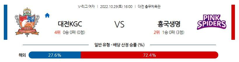 지난시즌 15승17패(3위) 성적으로 시즌을 마무리한 KGC인삼공사는 시즌 첫 경기 였던 직전경기(10/26) 원정에서 IBK기업은행 상대로 상대로 3-2(25:10 21:25, 25:27, 25:20, 15:8) 승리를 기록했다. 2021-2022시즌 페퍼저축은행에서 득점 6위(598점), 공격 성공률 4위(41.45%), 블로킹 10위(세트당 0.49개)를 기록한 엘리자벳(32득점, 39.44%)과 토종 에이스 이소영(24득점, 44.23%)의 득점이 폭발한 경기. 염혜선 세터가 흔들리자 교체 투입 된 박은지 세터가 상대 허를 찌르는 과감한 토스를 선보였고 선발 리베로로 출장해 경기의 처음부터 마지막까지 코트를 지켰던 최효서 리베로도 성공적인 경기력을 보인 상황. 또한, 이선우, 한송이 대신 투입 된 박혜진, 정호영이 소방수 역할을 톡톡히 해내는 가운데 서브 에이스(2-3) 숫자에서는 밀렸지만 블로킹(17-15), 범실(25-30) 대결에서 우위를 보였고 41.86%의 만족할수 있는 리시브 효율성을 기록한 승리의 내용.