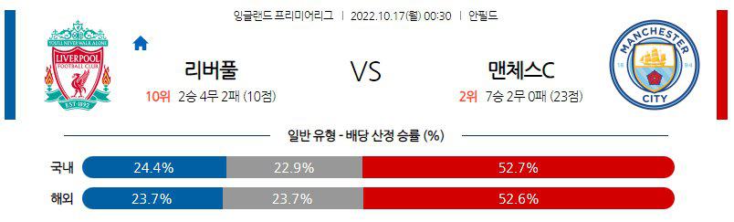 후술하겠지만, 리버풀은 시즌 초반 경기력도 좋지 않을 뿐더러 이번 일정에서 전력 누수까지 꽤나 큰 편. 특히나, 후보 수비수들로 세계 최고의 공격진을 보유한 맨체스터 시티를 상대해야 하는 상황이다. 반면 맨체스터 시티는 이번 시즌도 역시 극강의 모습으로 모든 대회에서 승점을 따내고 있다. 여기에 직전 UCL 경기에서 주력 선수들의 체력 안배까지 마친 상태. 이번 일정은 맨체스터 시티의 승리가 예상된다. 여기에 양 팀의 최근 5차례 맞대결 모두 오버(2.5 기준)가 나올 정도로 치고 받는 양상이었다. 오버(2.5 기준) 접근을 권장한다.
