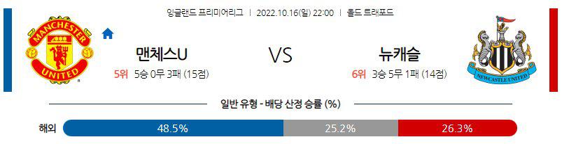 언더를 가져가야 한다. 뉴캐슬이 원정에서 맨유를 상대로 무리하지 않고 수비적인 운영으로 경기에 나설 것이기에 저득점이 유력하다. 맨유의 승리를 본다. 주중 유로파 일정이 있었지만 홈경기였기에 이동으로 인한 피로도가 없다. 또, 호날두와 엘랑가 등 벤치에서 나와 흐름을 바꿔줄 빠르고 결정력있는 공격수들이 있다. 뉴캐슬은 안정적인 수비로 경기에 임하겠지만 맨유의 파상공세에 승점을 따내지 못할 것이다.