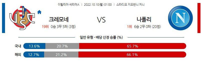 후술하겠지만, 크레모네세는 이번 시즌 승격한 전력으로, 승격 팀 중 아직까지 승리가 없는 유일한 팀. 특히나, 수비적으로 매우 불안한 모습을 보이고 있다. 반면 나폴리는 이번 시즌 극강의 모습을 보여주며 리그와 유럽대항전에서 연일 승리를 따내고 있다. 특히나, 빠른 전개의 빌드업이 가장 돋보인다. 이번 일정도 나폴리의 승리가 예상된다. 다만, 나폴리가 3일 후에 있을 UCL 경기를 대비해 로테이션을 돌릴 가능성이 높다. 언더(2.5 기준) 선택지를 겸하는 편이 낫겠다.
