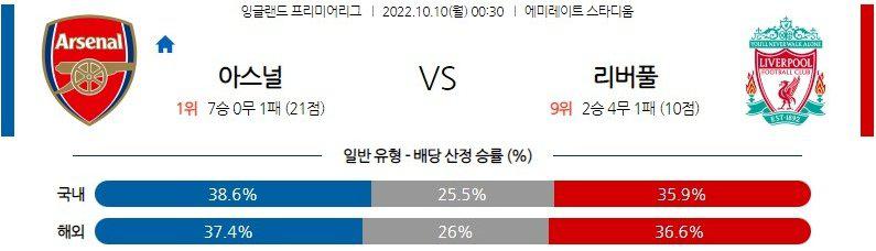최근 흐름은 매우 좋다. 직전 리그 경기인 토트넘전에서 3-1 승리를 거두며 리그 1위 자리를 고수하고 있는 중.심지어 UEL에서도 2승을 따내며 모든 공식 경기에서 단 1패만을 허용하고 있다.최근 부상자들이 속속 복귀를 하며 전체적인 구멍이 사라진 상태. 또한, 아르테타 감독은 직전 UEL 경기에서 로테이션을 가동하며 주력 선수들의 체력까지 안배해 놓았다. 100%에 가까운 전력과 컨디션으로 맞설 수 있겠다.다만, 한 가지 걸림돌은 아스날의 리버풀 징크스다. 최근 10경기에서 리버풀에게 거둔 승리는 단 한 번으로, 리버풀의 강력한 압박에 유독 고전하는 모습을 보이고 있다. 해당 1승 경기에서도 점유율(70% : 30%)과 슈팅 횟수(24 : 3) 모두 크게 밀렸으며, 당시 골문을 지키던 마르티네즈 골키퍼의 신들린 선방이 없었다면 승리를 따내지 못했다. 리버풀의 최근 팀 컨디션이 다시 올라오고 있는 추세로, 이번 일정에서도 쉽게 승리를 따내지는 못할 전망이다.