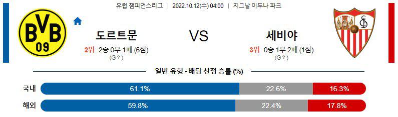세비야 - 2022/23시즌 유럽 UEFA챔피언스리그 조별예선 G조 3라운드 [ 1무 2패 ]의 성적을 기록하면서 홈에서 도르트문트를 상대로한 3라운드에서의 패배를 기록하면서 세비야도 이번 독일로 이동해야하는 원정경기에서의 부담감이 더욱더 커질 수 밖에 없다는 사실을 기억해보게 되는데, 세비야의 플레이를 의지해보기가 쉽지않아보이는 이유를 고려해보게 된다면 이번 시즌 스페인 라리가를 포함해서 22/23시즌이 개막한 이후에 부진한 모습이 계속해서 이어지고 있다는 사실을 기억해보게 된다는 사실만을 고려해보아도 결과를 위해서는 공격적으로의 플레이 과정도 단조로운 모습이 이어지지만 세비야가 유럽대항전을 통해서 보여줄 수 있었던 수비에서의 결과도 조금은 실망스러운 모습을 보여주었다는 사실에서 세비야에 플레이를 의지해보기가 쉽지않아보이는 것이 사실이다.
