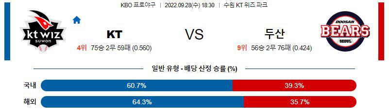 어제 KT선발 벤자민이 7이닝 1실점(비자책), 최원준이 7이닝 1실점을 펼쳐주면서 투수전이 펼쳐졌다. 그리고 두팀 선발이 내려간 8회초 두산이 집중력있게 3득점 빅이닝을 만들어내면서 4-1 리드를 점했고 8회말 불펜의 핵 정철원이 올라왔다. 그런데 2루타와 볼넷, 그리고 강백호에게 동점쓰리런을 허용하며 마운드를 내려가버렸고 9회 홍건희를 상대로 배정대가 끝내기 안타를 때려내면서 5-4 KT가 역전승 달성에 성공했다. 그리고 오늘 2차전이 펼쳐지게 되는데 오늘도 KT가 승리를 기록할 것으로 예상된다. 일단 선발 경쟁력에서부터 차이가 큰 상황!! KT소형준은 최근 피칭흐름이 준수하고 올시즌 두산전 성적도 아주 좋았다. 반면 두산선발 최승용은 최근 연속된 선발등판 속에서 다소 지친 모습을 보여주고 있습니다. 또한 어제 두산 불펜 정철원역시 2루타 2개와 홈런 1개를 허용하면서 힘이 떨어진 모습이였다. 그리고 어제 박병호의 공백속에서 김준태와 강백호가 홈런을 기록했고 알포드도 담장상단을 때리는 2루타를 만들어낸 만큼 KT 중심타자들의 활약도 상당히 인상적이였다. 따라서 오늘 경기는 KT가 투타에서 우위를 점하며 승리를 기록할 것으로 예상된다. (또한 KT는 후반기 홈승률 1위를 기록하고 있기도 하다.)