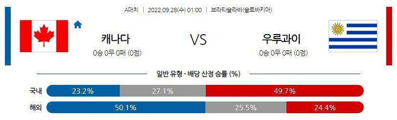 우루과이의 승리를 본다. 캐나다는 뮌헨의 레프트백인 알폰소 데이비스가 대표팀에서 프리롤로 나서며 중앙과 측면 등에서 확실하게 팀을 이끌고 있다. 그러나, 중앙에서는 벤탄쿠르, 측면에서는 올리베라 등 수비력이 좋은 선수들의 견제를 받아야 한다. 누네스와 발베르데가 피지컬이 좋지만 다소 느린 상대의 최종수비를 돌파로 넘어설 수 있고 수아레스가 해결할 우루과이가 승리할 것이다. 캐나다의 수비적 운영이 예상되기에 언더 경기다.
