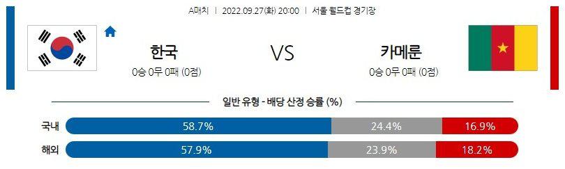 후술하겠지만, 한국은 직전 경기에서 코스타리카를 상대로 무승부에 그쳤으나, 해외파 선수들의 컨디션이 100%가 아니었던 상황. 그럼에도 손흥민(FW), 황희찬(FW), 김민재(DF)와 같은 선수들은 클래스 있는 모습을 보여줬다. 핵심 선수들의 이탈로 인해 겨우 전력의 50% 가량을 데리고 이번 경기에 출전할 것으로 예상되는 카메룬을 상대로 승리까지는 어렵지 않겠다. 다만, 직전 경기에서 보여줬던 수비 불안은 단기간에 해결되지 않을 예정. 언더(2.5 기준)를 겸하는 선택지도 권장한다.