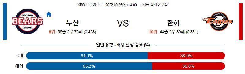 곽빈(7승 8패 3.69)이 연패 저지를 위해 마운드에 오른다. 20일 NC와 홈 경기에서 5.2이닝 2실점의 투구로 승리를 거둔 곽빈은 9월 들어서 팀내 선발 투수들중 가장 안정적인 투구가 이어지는 중입니다. 특히 홈 경기에 강한 편인데 8일 한화전의 6이닝 3실점보다는 더 좋은 투구를 해낼수 있을 것입니다. 전날 경기에서 이태양에게 막혀 있습니다가 SSG의 불펜을 무너뜨리면서 홈런 2발 포함 5점을 득점한 두산의 타선은 비록 패배하긴 했지만 원정에서 나름 집중력을 유지합니다는 점이 고무적입니다. 일단 한화 상대 홈 경기는 항상 좋은 편입니다. 그러나 8실점을 허용한 불펜은 내년을 위해 정비하는것도 쉽지 않아 보인다.