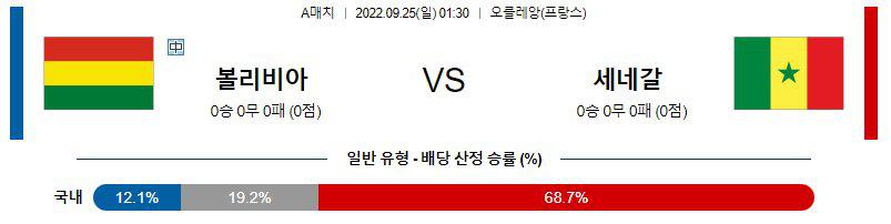 후술하겠지만, 볼리비아는 최악의 월드컵 예선 성적으로 인해 기존 감독을 경질했으며, 새 감독의 첫 경기이기에 조직력도 100%가 아닌 상황입니다. 반면 세네갈은 아프리카 네이션스컵 우승으로 대표팀 분위기도 좋은 편이며, 동기부여도 충만한 상태. 선수 면면도 볼리비아에 비할 바는 아니다. 이번 일정도 세네갈의 승리가 예상된다. 다만, 세네갈의 ""No.1 골키퍼"" 멘디(GK)가 부상으로 이탈한 상황. 1실점 정도의 가능성은 열어두는 것이 좋겠다. 오버(2.5 기준) 양상으로 전개될 가능성이 높겠다.