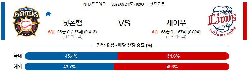마츠모토 와타루(6승 6패 3.41)가 시즌 7승 도전에 나선다. 17일 라쿠텐과 홈 경기에서 5이닝 3실점의 부진으로 패배를 당한 마츠모토는 최근 들어서 기복이 심한 투구가 이어지는 중입니다. 닛폰햄 상대로 홈에서 7이닝 무실점, 원정에서 9.2이닝 3실점 투구를 하는등 닛폰햄에겐 QS+이상을 기대할수 있을 정도로 강한 투수인데 최근 야간 경기에서 흔들리는 문제를 고쳐야 합니다. 화요일 경기에서 라쿠텐의 투수진 상대로 4점을 득점한 세이부의 타선은 확실히 토노사키 슈타의 복귀가 큰 힘이 되고 있다. 그러나 팀내 분란이 팀 분위기에 악영향을 미칠수 있다는게 문제가 될듯. 타이라의 마무리는 마스다보다는 조금 더 나은것 같다.