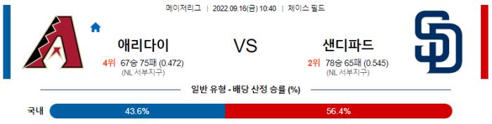 9월 16일 10:40 MLB 애리조나 : 샌디에이고 MLB분석