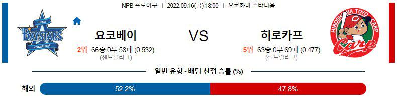 오오세라 다이치(8승 8패 4.51)가 시즌 9승에 도전합니다. 9일 야쿠르트 원정에서 5.2이닝 7실점의 부진으로 패배를 당했던 오오세라는 3개의 홈런을 허용한게 결정적이었다. DeNA 상대로 2일 홈에서 7이닝 무실점 승리를 거두었고 원정 완봉승도 있는등 유독 DeNA 상대로 강합니다는게 유일한 강점입니다. 수요일 경기에서 한신의 투수진을 흔들면서 니시카와 료마의 홈런 포함 5점을 득점한 히로시마의 타선은 비록 패배하긴 했지만 원정에서 좋은 타격감을 유지하고 있습니다는 점이 고무적입니다. 다만 최근 하마스타 원정 5연패를 당하고 있습니다는게 문제가 되는 부분. 아무래도 이 팀의 불펜은 쿠리바야시를 제외한 나머지 투수들은 패배하고 있을때만 잘 던지는것 같다.
