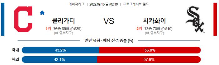 9월 16일 02:10 MLB 클리블랜드 : C.화이트삭스 MLB분석