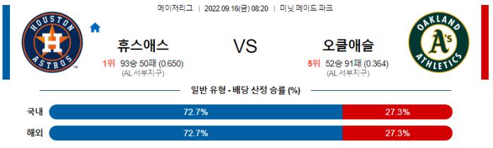 9월 16일 08:20 MLB 휴스턴 : 오클랜드 MLB분석