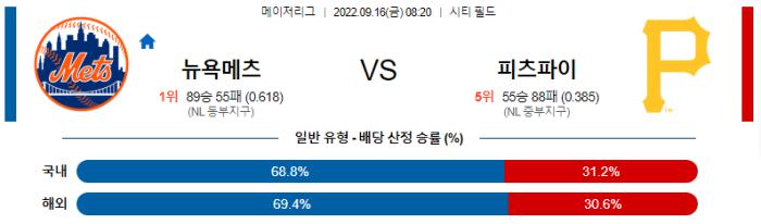 9월 16일 08:20 MLB 뉴욕 메츠 : 피츠버그 MLB분석