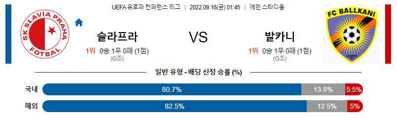 슬라비아프라하가 이번 시즌 모든 홈 경기에서 오버(2.5 기준)가 나왔다. 오버(2.5 기준) 가능성이 높겠다. 또한 슬라비아프라하는 이번 시즌 역대급 공격력을 보여주고있습니다. 감히 말하자면 유럽 주요 리그들을 제외하고 가장 뛰어난 공격력을 보여주고 있습니다고 해도 과언이 아닐 정도. 반면 발카니는 유럽 대항전 경험도 적은 코소보 리그의 팀이며, 이들의 수비진은 공중전에서는 강한 모습을 보일지 몰라도 속도전에서는 약점이 있습니다. 이번 일정도 슬라비아프라하의 승리가 예상된다.
