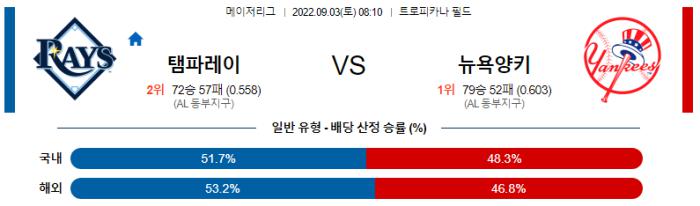 9월 3일 08:10 MLB 탬파베이 : 뉴욕양키스 MLB분석