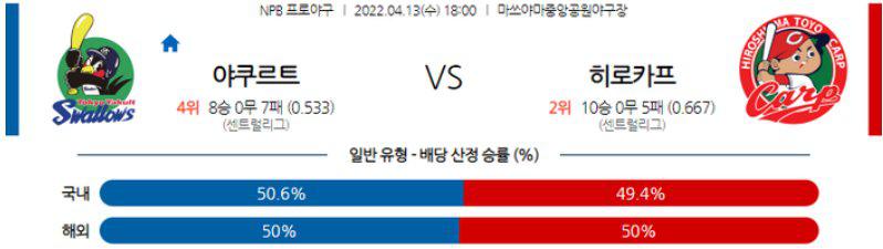 중립구장 경기로 펼쳐지는 경기다. 타카나시 히로토시 투수가 2연승으로 시즌을 출발하고 있지만 최근 5시즌 동안 24승29패 성적을 기록한 투수였다는 것을 체크해야 한다. 반면, 토코다 히로키 투수는 지난 시즌의 야쿠르트를 상대로 4경기에 나와서 0.197의 피안타 허용률을 기록한 상대전 천적이 되었던 투수다.히로카프 승리 가능성을 추천 한다.
