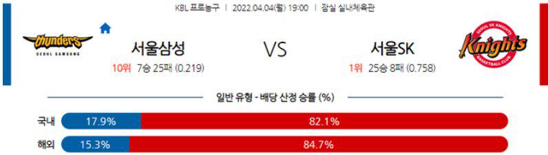 외국인 선수가 모두 부상으로 정상 컨디션이 아니며 출전 가능성 자체가 불투명한 서울 삼성 이다. 제공권 싸움에서 서울SK가 우위를 점령할 것이다. 서울SK 승리 가능성을 추천 한다.