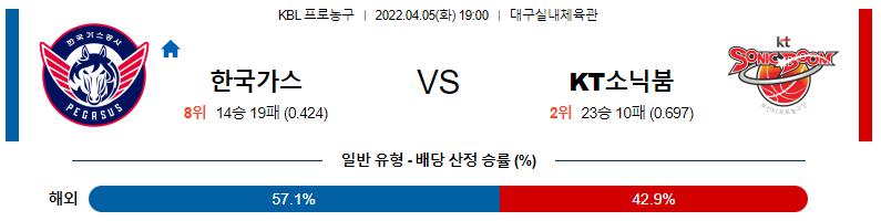 한국가스공사는 직전경기(4/3) 홈에서 KGC인삼공사 상대로 102-85 승리를 기록했으며 이전경기(4/1) 원정에서 전주 KCC 상대로 88-76 승리를 기록했다. 2연승 흐름 속에 시즌 26승27패 성적. KGC인삼공사 상대로는 12개 3점슛을 50%의 높은 적중률 속에 림에 꽂아 넣는 가운데 64.1%의 높은 야투 성공률을 기록한 경기. 앤드류 니콜슨(27득점)이 '득점 기계'로서의 모습을 보여줬고 디제이 화이트(17득점)의 활약이 더해지면서 골밑을 장악할수 있었고 홍경기(17득점), 두경민(12득점)의 움직임이 살아나면서 김낙현(2득점, 8어시스트)의 부담이 많이 줄어들수 있었던 상황. 또한, 베스트5 싸움에서 우위를 점령하는 가운데 승부처에 높은 집중력을 보여준 승리의 내용.