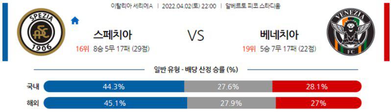 【세리에A】 4월 2일 스페치아 칼초 vs 베네치아