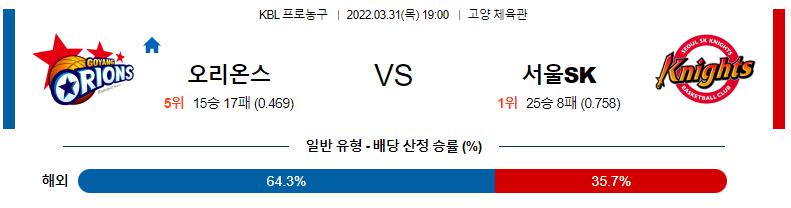 [WKBL] 3월 31일 고양 오리온 오리온스 vs 서울 SK 나이츠