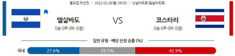 언더(2.5)를 주력으로 가져가면 좋다 코스타리카도 경기의 중요성을 생각하면 한 골 승부를 가져가려 할 것이며, 엘살바도르가 5백을 쓸 것이 유력한 코스타리카 수비벽을 넘기에는 공격력이 좋지 못하다. 동기부여가 확실한 코스타리카가 유리한 승부다.