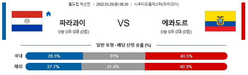 저득점 페이스가 유력하다. 파라과이가 템포를 굉장히 낮출 가능성이 높으며, 에콰도르도 득점 때문에 급할 이유는 없다. 지루한 경기 끝에 무승부가 되는 시나리오가 가장 유력하다. 언더(2.5)를 주력으로 삼으면 가장 확률이 높을 것이다.