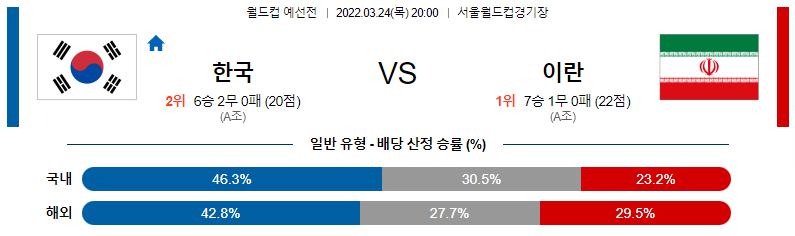 한국의 승리를 예측할 수 있다. 홈에서 관중들의 응원을 받을 수 있다는 점과, 이란의 전력 누수가 굉장히 심하다는 점을 고려해야 할 것이다. 그러나 최근 이란과의 맞대결에서 고전했음을 고려하면 다득점은 기대하기 어려울 것이다.