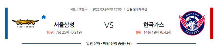 [KBL] 3월 24일 서울삼성 vs 한국가스공사서울 삼성은 직전경기(3/22) 원정에서 KGC인삼공사 상대로 66-82 패배를 기록했으며 이전경기(3/20) 원정에서 수원KT 상대로 83-98 패배를 기록했다. 8연패 흐름 속에 시즌 9승40패 성적. KGC인삼공사 상대로는 삼성의 외국인 선수 아이제아 힉스와 제키 카마이클이 모두 부상으로 결장한 공백이 크게 나타난 경기. 이원석(15득점)을 제외하고는 두 자리수 득점을 기록한 선수가 나오지 않았고 최근 부진의 늪에 빠져 있는 슈팅 가드 포지션의 문제점이 여전했던 상황. 또한, 1쿼터(13-22) 리드를 빼앗긴 이후 별다른 반전을 만들지 못했고 2경기 연속 가비지 타임을 허용한 패배의 내용
