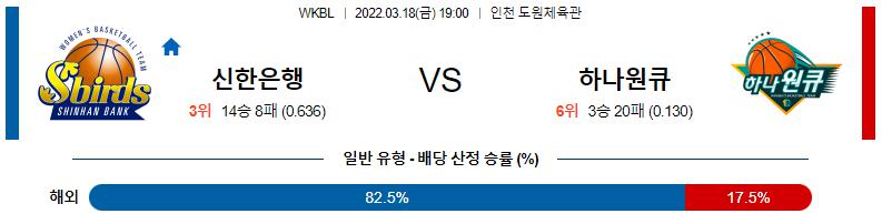 신한은행의 마지막 퍼즐이 되는 주전 빅맨 한엄지(20~25분)가 복귀전 보다는 출전 시간을 늘릴 것으로 예상되며 베스트5의 전력 구성과 팀 조직력에서 신한은행이 한수위에 있다. 신한은행 승리 가능성을 추천 한다.