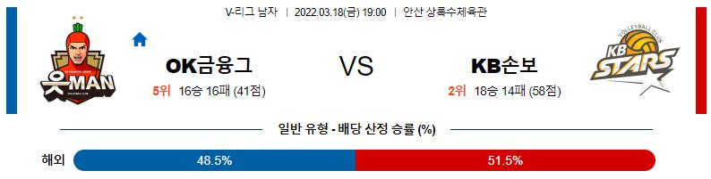 OK저축은행은 직전경기(3/15) 홈에서 한국전력 상대로 1-3(25:19, 23:25, 19:25, 23:25) 패배를 기록했으며 이전경기(3/11) 원정에서 우리카드 상대로 1-3(25:23, 19:25, 19;'25, 20:25) 패배를 기록했다. 2연패 흐름 속에 시즌 16승16패 성적. 한국전력 상대로는 레오(38득점, 57.89%)가 분전했고 1세트를 먼저 가져오며 좋은 출발을 보였지만 2,3세트 크게 벌려놨던 점수 차를 유지하지 못하며 세트를 내주면서 분위기가 꺽였던 경기. 블로킹(16-9) 싸움에서 우위를 보였지만 리시브 라인이 흔들리는 가운데 서브(6-10) 싸움에서 밀렸고 범실(24-21)도 많았던 상황. 또한, 곽명우 세터의 공격 패턴이 쉽게 노출되면서 상대에게 가로막혔고 4세트에는 권준형 세터가 교체 투입 되었지만 별다른 반전을 만들지 못했던 패배의 내용.